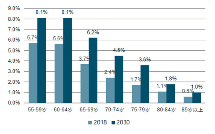 近年来,我国人口老龄化速度正在加快。根据数据,2018年我国65岁以上老龄人口超过1.5亿,占总人口比例的11%,预计到2030年,国内65岁以上老龄人口将超过2.4亿,占国内人口总量的17.1%,占全球老龄人口的四分之一。